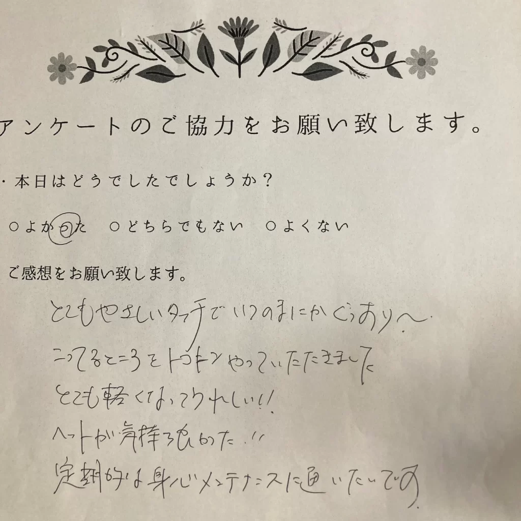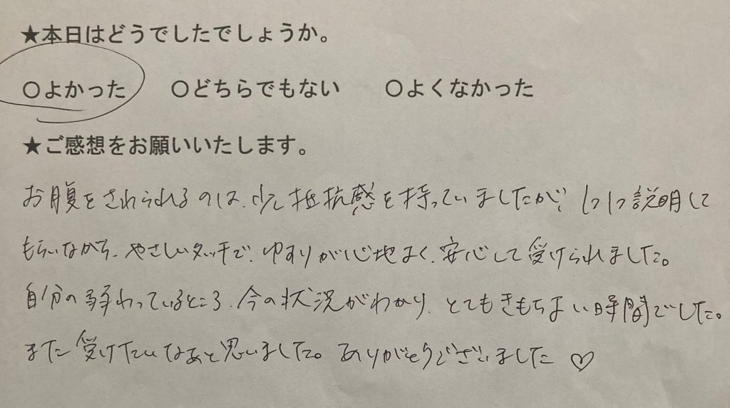 お腹をさわられるのは、少し抵抗感を持っていましたが、1つ1つ説明してもらいながら、やさしいタッチで、ゆすりが心地よく、安心して受けられました。