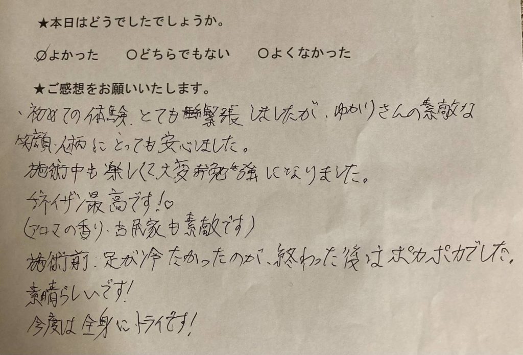 初めての体験、とても緊張しましたが、ゆかりさんの素敵な笑顔、人柄にとっても安心しました。