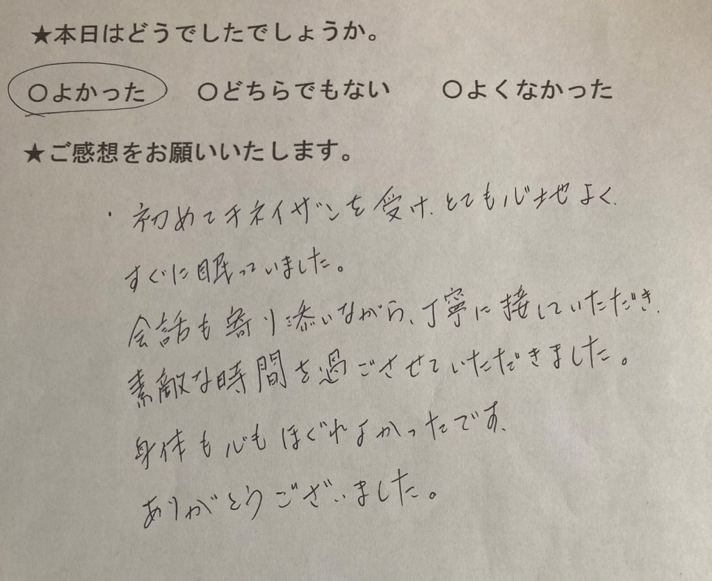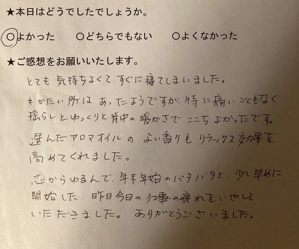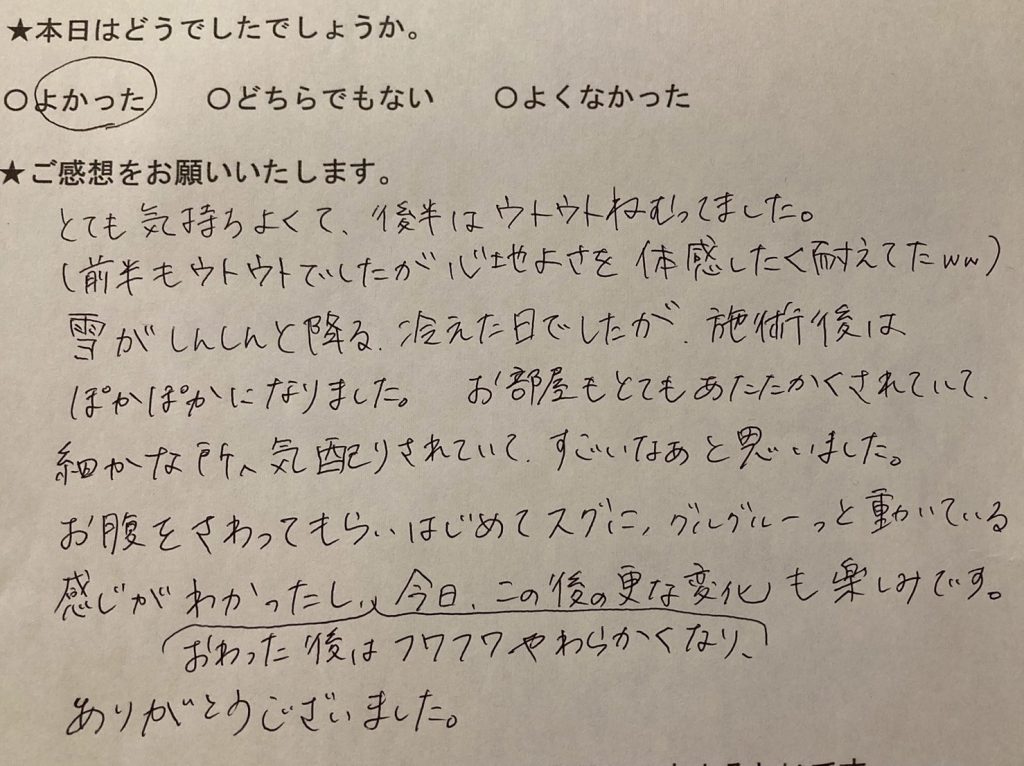 雪がしんしんと降る冷えた日でしたが、施術後はぽかぽかになりました。お部屋もとてもあたたかくされていて、細かなところへ気配りされていて、すごいなぁとおもいました。