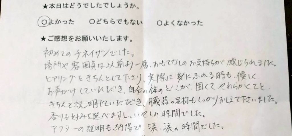 自分の弱っているところ、今の状況がわかり、とてもきもちよい時間でした。
