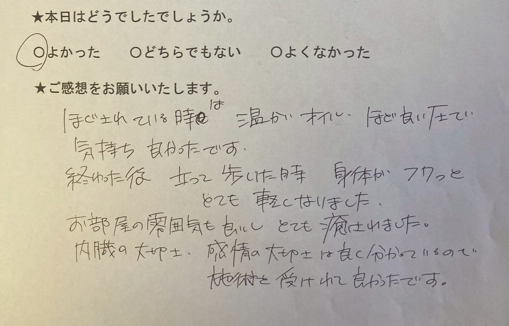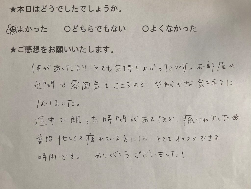 体があったまりとても気持ちよかったです。お部屋の空間や雰囲気もここちよく、やわらかな気持ちになりました。