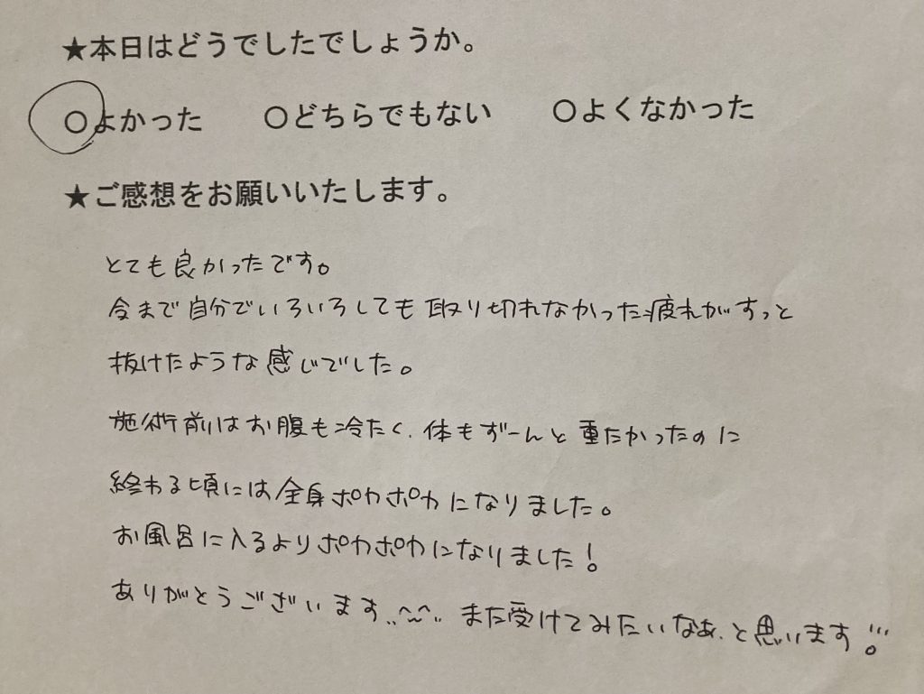 施術前はお腹も冷たく、体もずーんと重たかったのに終わる頃には全身ポカポカになりました。